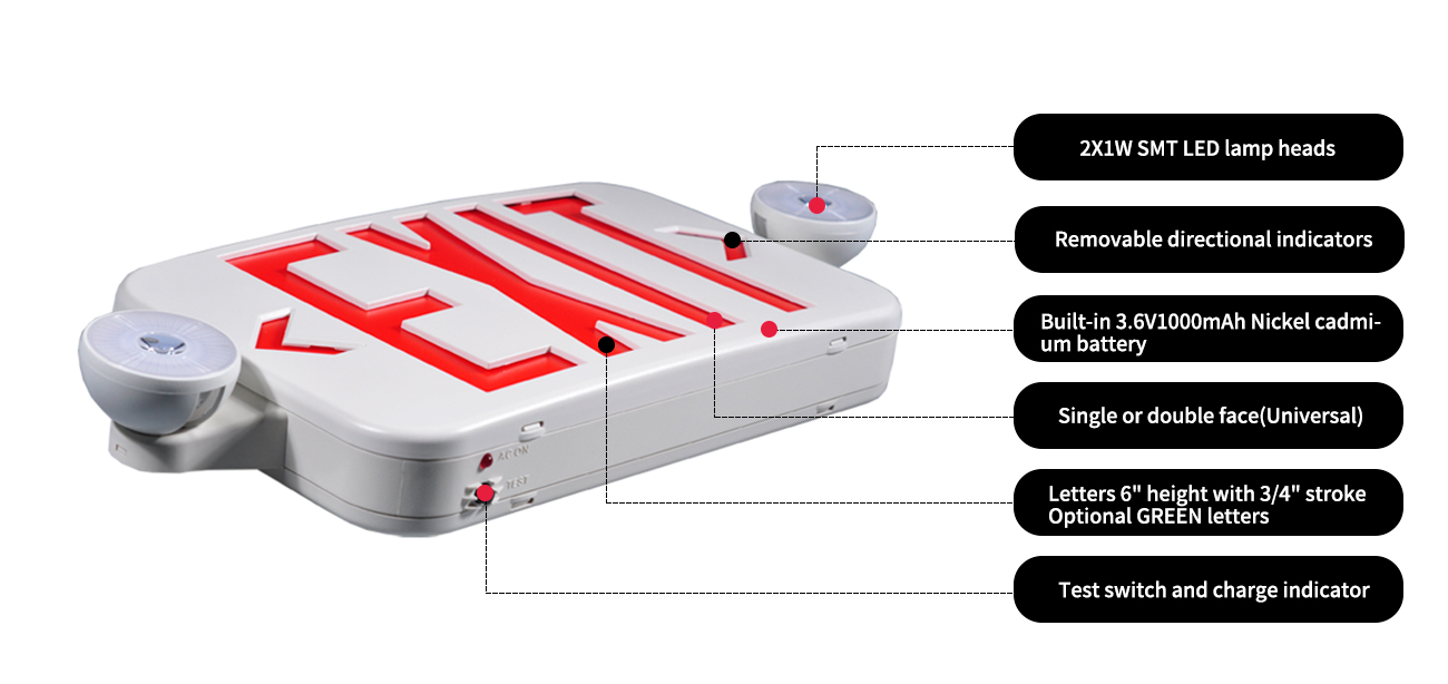Combo Light Exit Exit / Exite Exit. Jimat wang membeli produk 2-in-1 ini. Panjang tahan lama, penyelenggaraan bateri Ni-Cad yang rendah. Bekerja pada 120 - 277 VAC Voltan Universal. Faceplate termasuk anak panah kiri/kanan knock-out. Perlawanan adalah 1 atau 2 sisi. Produk disenaraikan UL dan memenuhi kod kecemasan NFPA 101, OSHA dan UL 924. Sebagai sebuah rumah, pencahayaan komersial dan perindustrian, sesuai untuk lorong, koridor, hospital, pangsapuri, gereja, pusat membeli -belah, pasar raya, sekolah, hotel, pub, restoran, gudang, bangunan pejabat, dll.