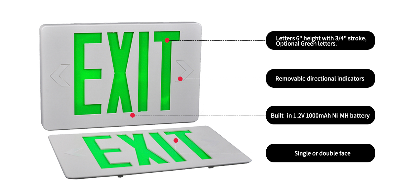 Tanda keluar yang mudah, cekap dan selamat disenaraikan dengan 6 "huruf LED hijau. Unit ini memerlukan operasi voltan sejagat 120 - 277 VAC.